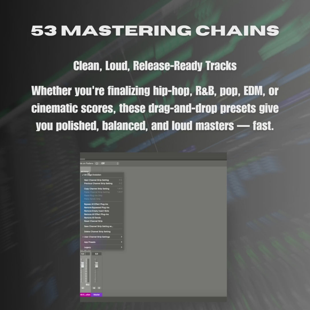 Ya sea que estés finalizando partituras de hip-hop, R&B, pop, EDM o cinematográficas, estos ajustes preestablecidos de arrastrar y soltar te brindan masters pulidos, equilibrados y potentes, rápidamente.