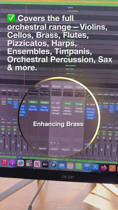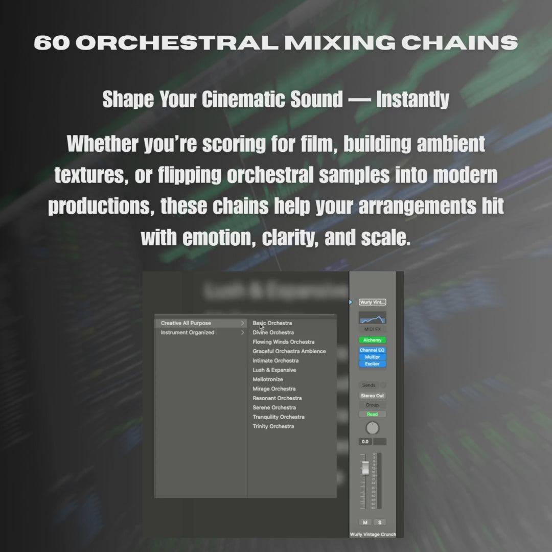 Dale a tus instrumentos de cuerda, metal, viento madera y percusión la profundidad, claridad e impacto que merecen. Este paquete te ofrece 60 cadenas de bus personalizadas, diseñadas para dar vida a los instrumentos orquestales, ya sea que estés componiendo bandas sonoras para películas, produciendo trap sinfónico o combinando baladas pop con un toque de lujo.