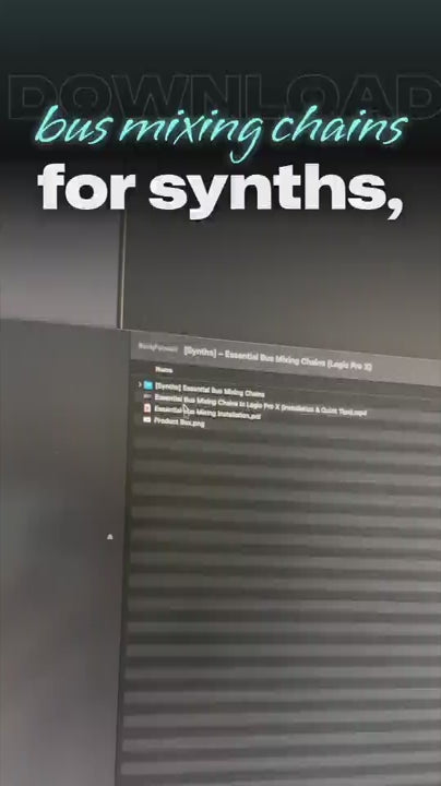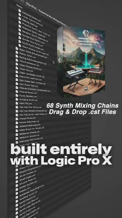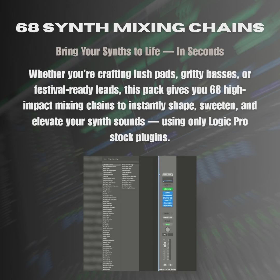 Ya sea que estés creando pads exuberantes, bajos atrevidos o leads listos para festivales, este paquete te brinda 68 cadenas de mezcla de alto impacto para dar forma, endulzar y elevar instantáneamente tus sonidos de sintetizador, usando solo complementos estándar de Logic Pro.